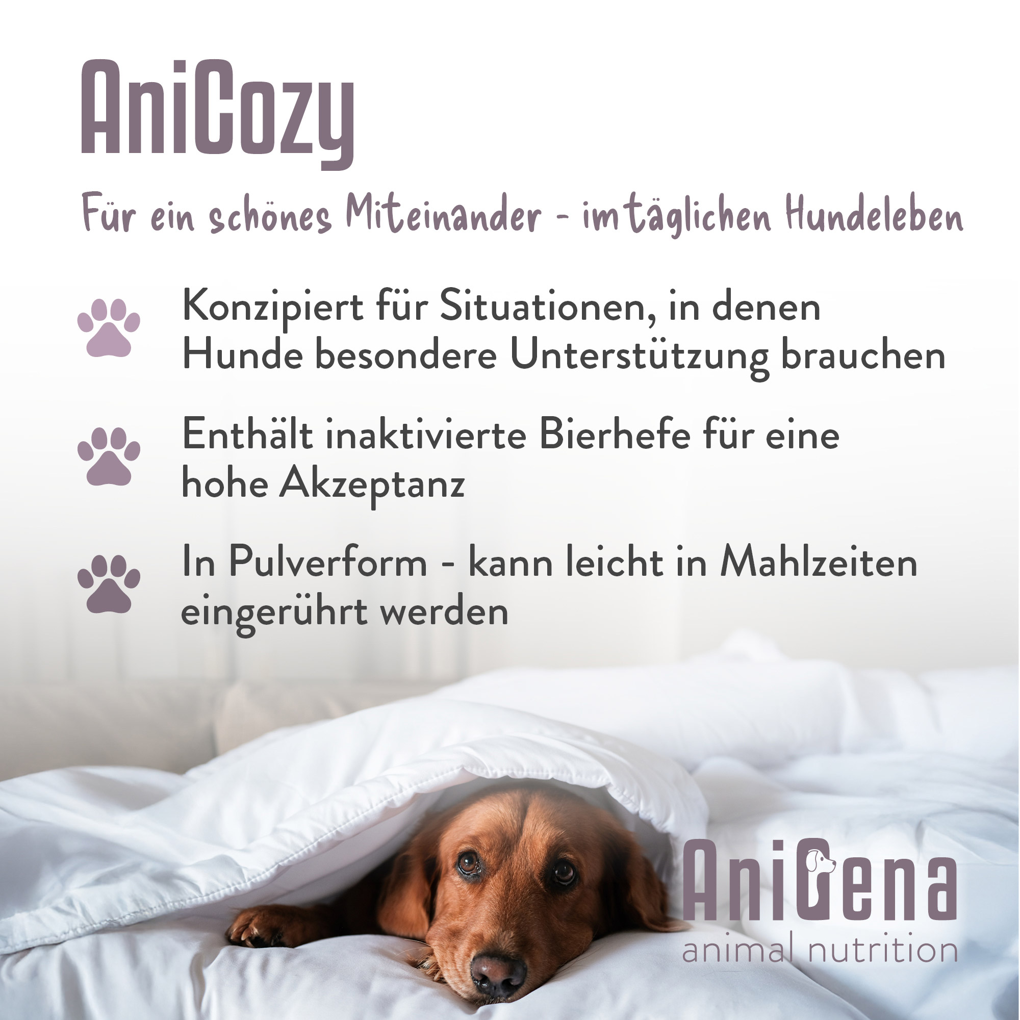 AniCozy ist ein hochwertiges Ergänzungsfuttermittel für Hunde, das gezielt entwickelt wurde, um das Wohlbefinden und die natürliche Ausgeglichenheit deines Hundes zu unterstützen. Die Rezeptur mit Molkeneiweiß und Bierhefe liefert wertvolle Nährstoffe und ist besonders schmackhaft.